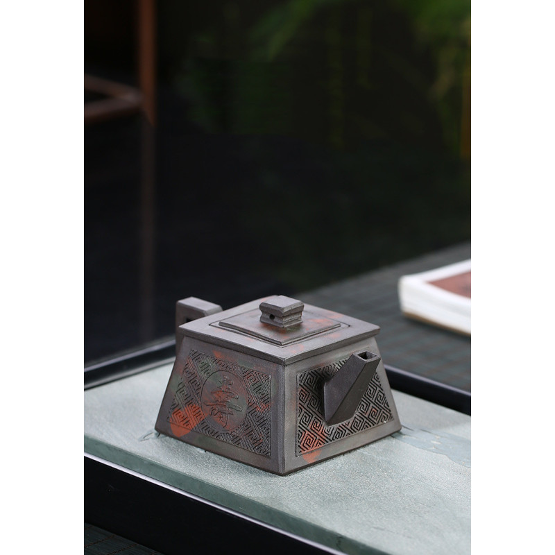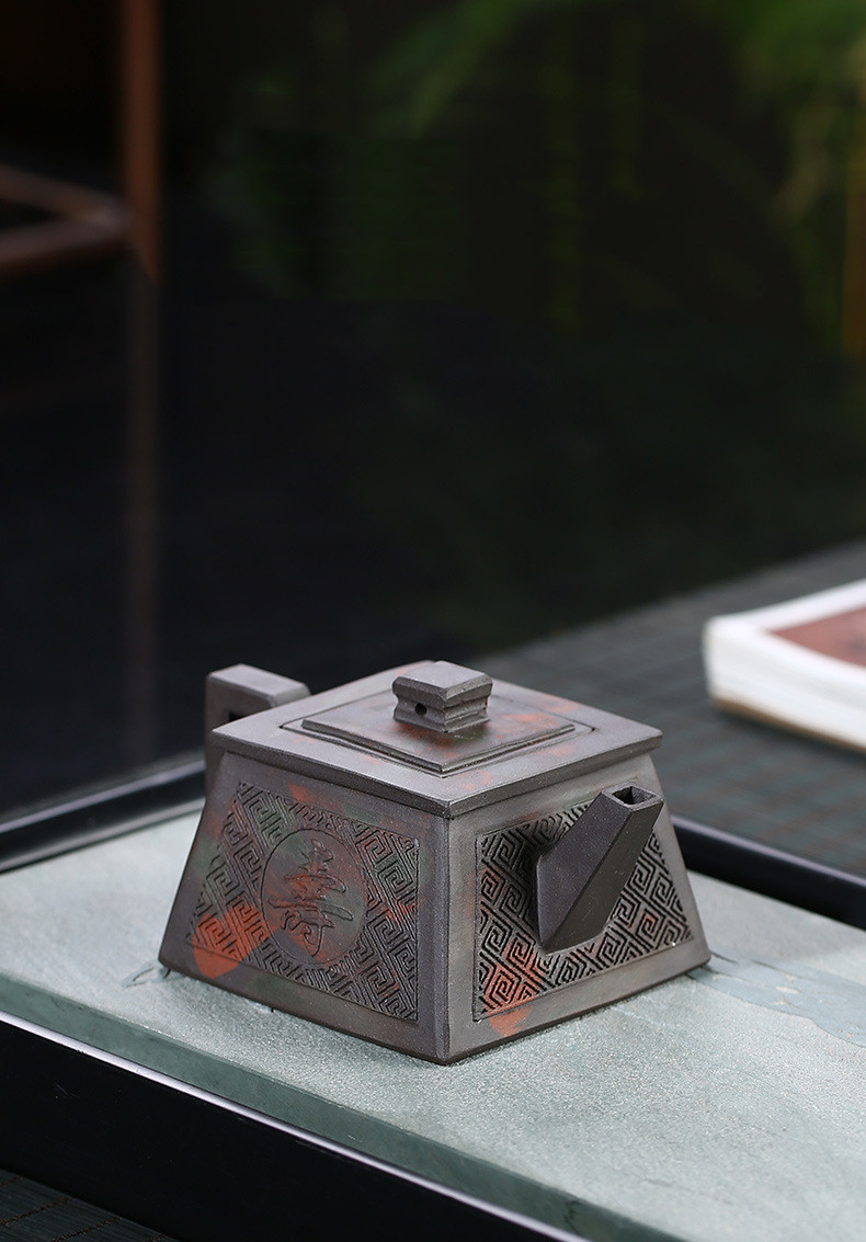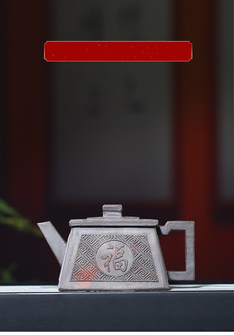 Introduction: The work is hand-made with black mud from raw ore. The shape of the pot is simple and simple, the body of the pot is square, the shape is full and generous, and the lines are distinct. Both sides of the pot body are decorated and carved with the decorative technique of opening the frame and the decorative means of twisting mud, which achieves a special artistic effect of "Fu Shou".