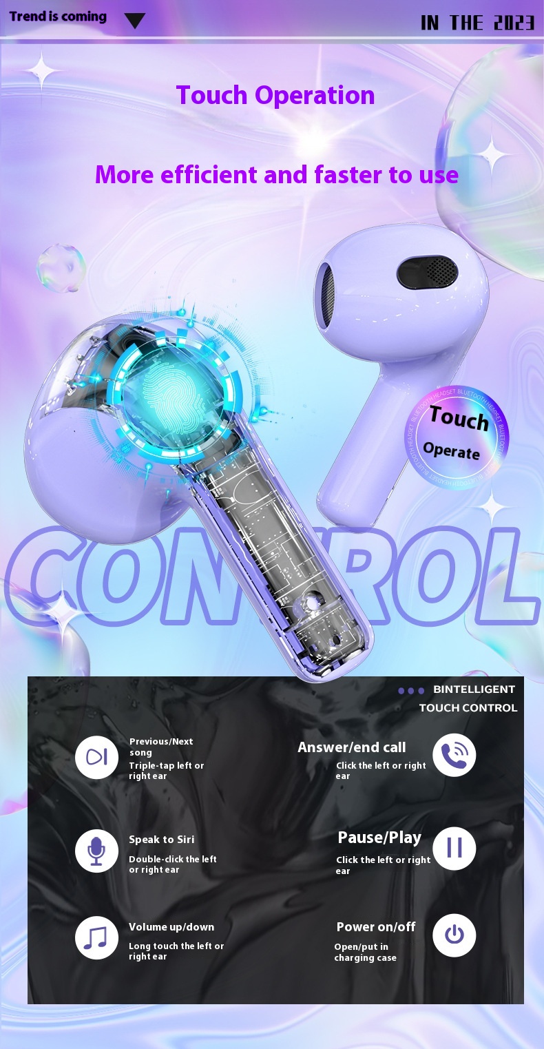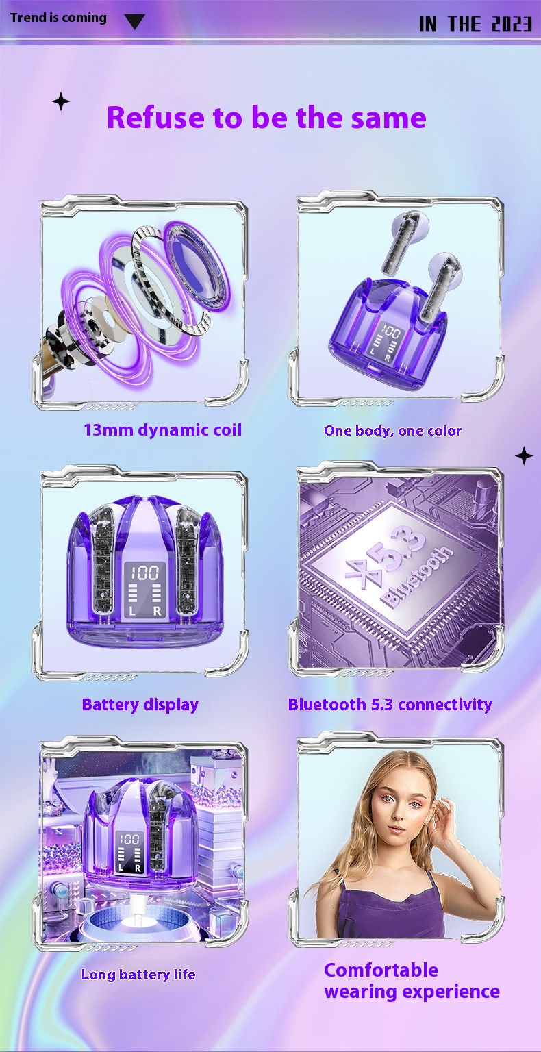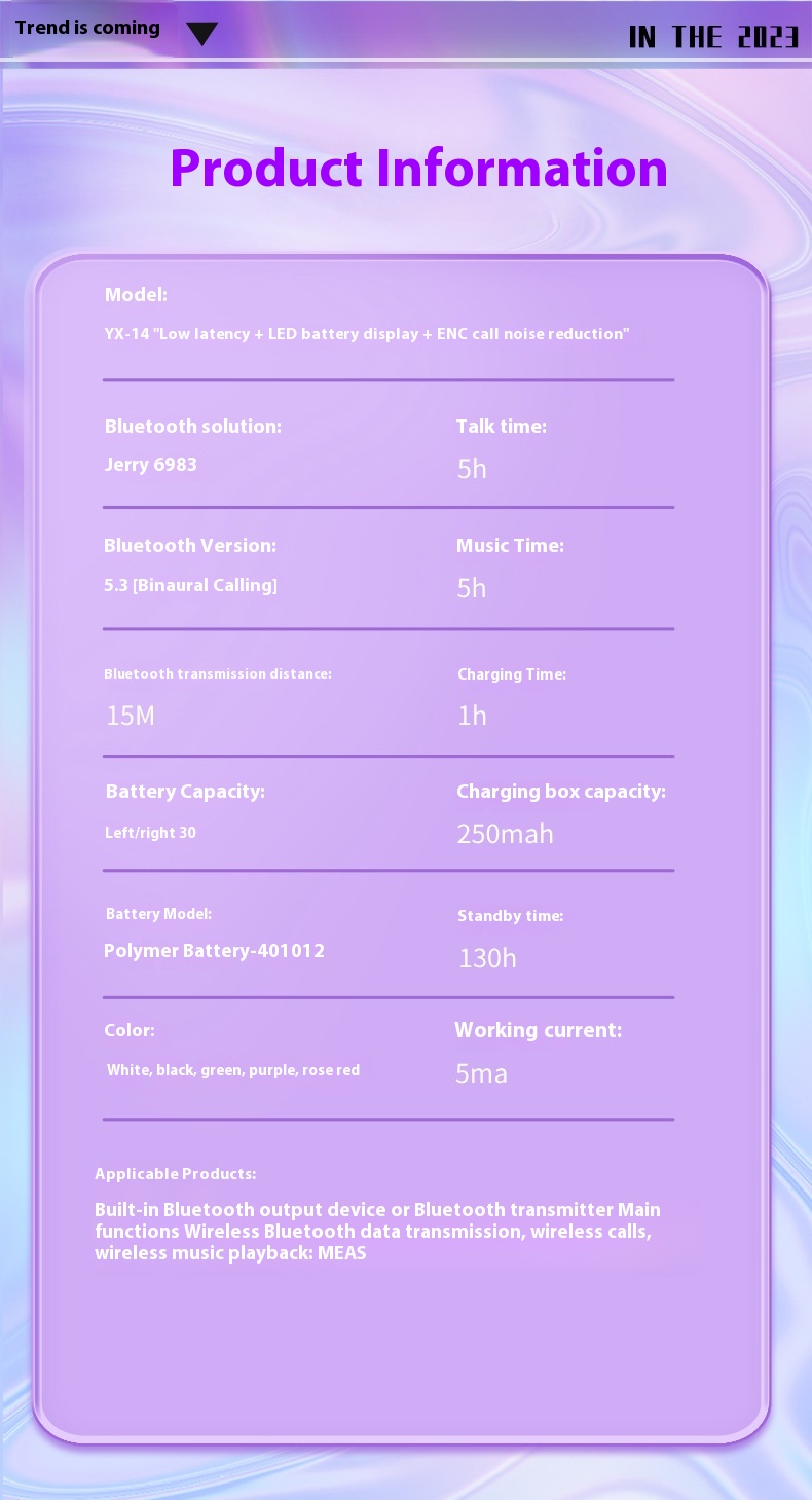 Functions: Waterproof, wireless charging, noise reduction, ultra-long life battery, call function, voice control, support music, digital display screen, e-sports low latency