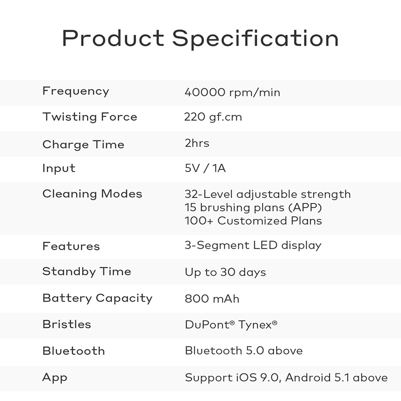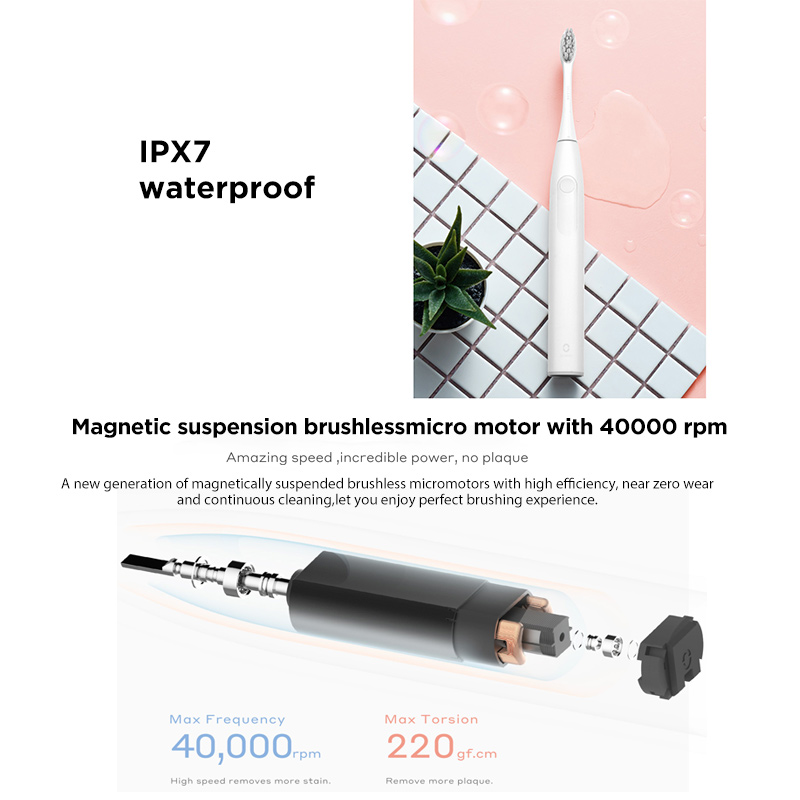 7. Waterproof grade: IPX7 (toothbrush body); IPX5 (charging base) 7