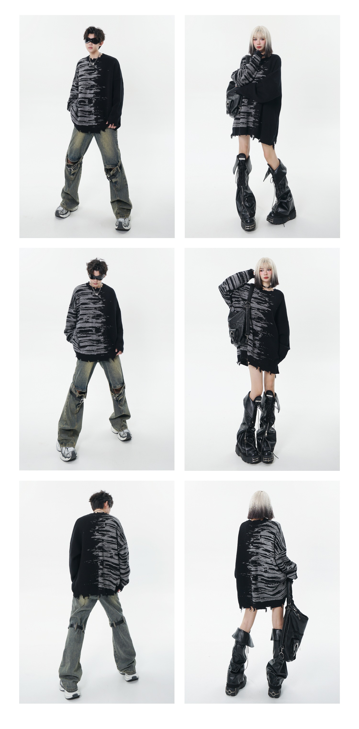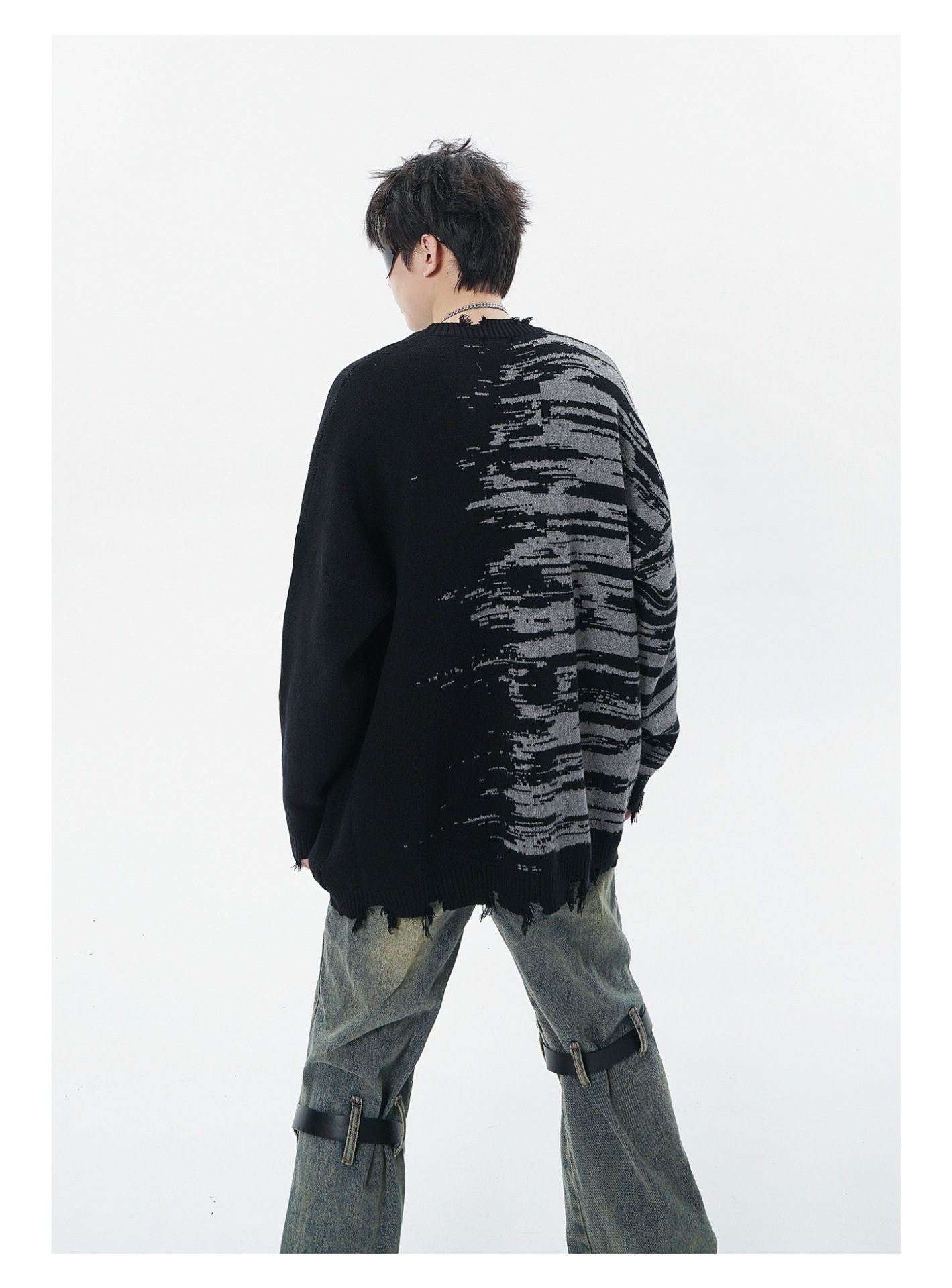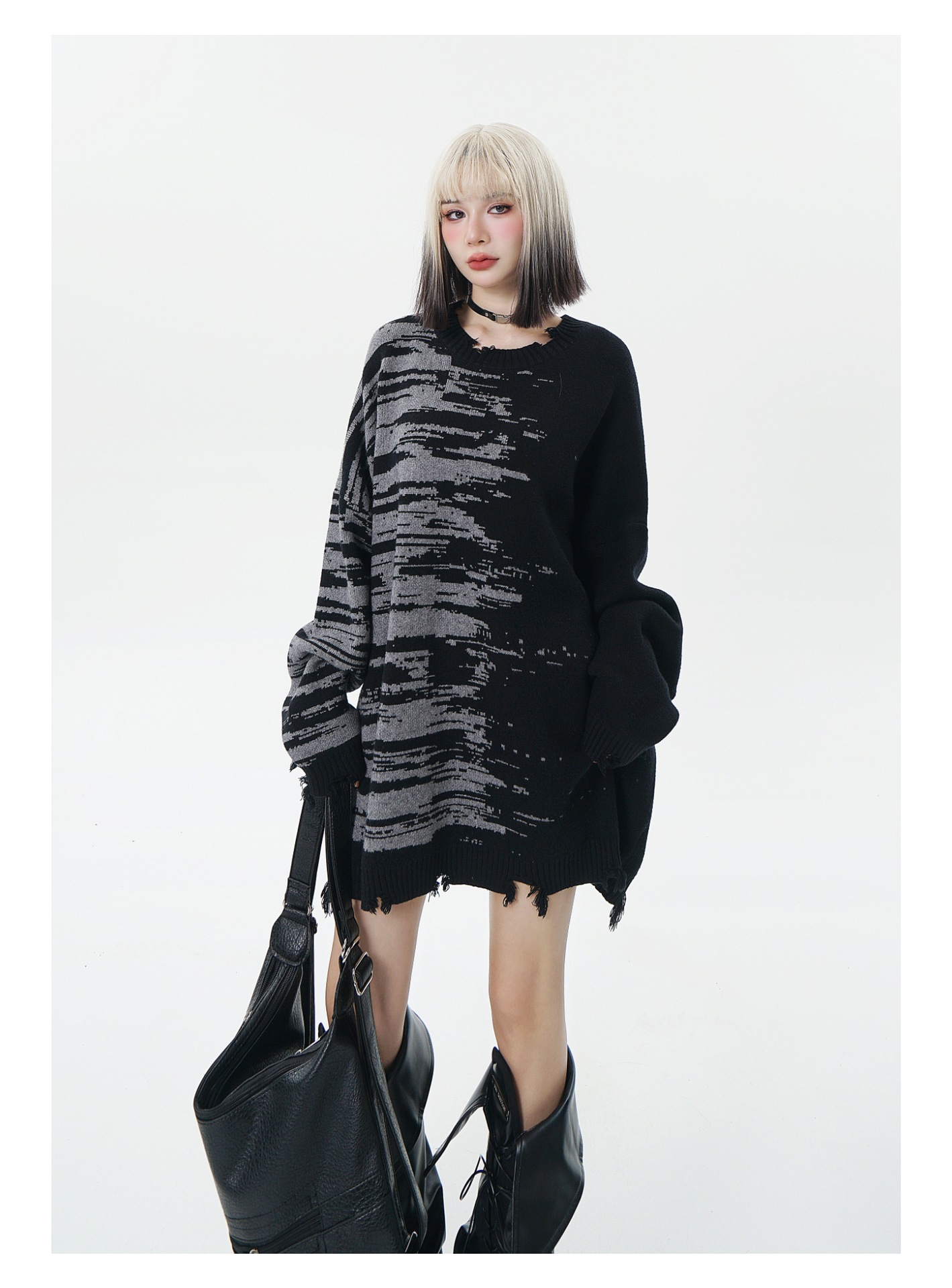 Zebra Pattern Color Matching Ripped Tassel Loose Round Neck Knitted Sweater