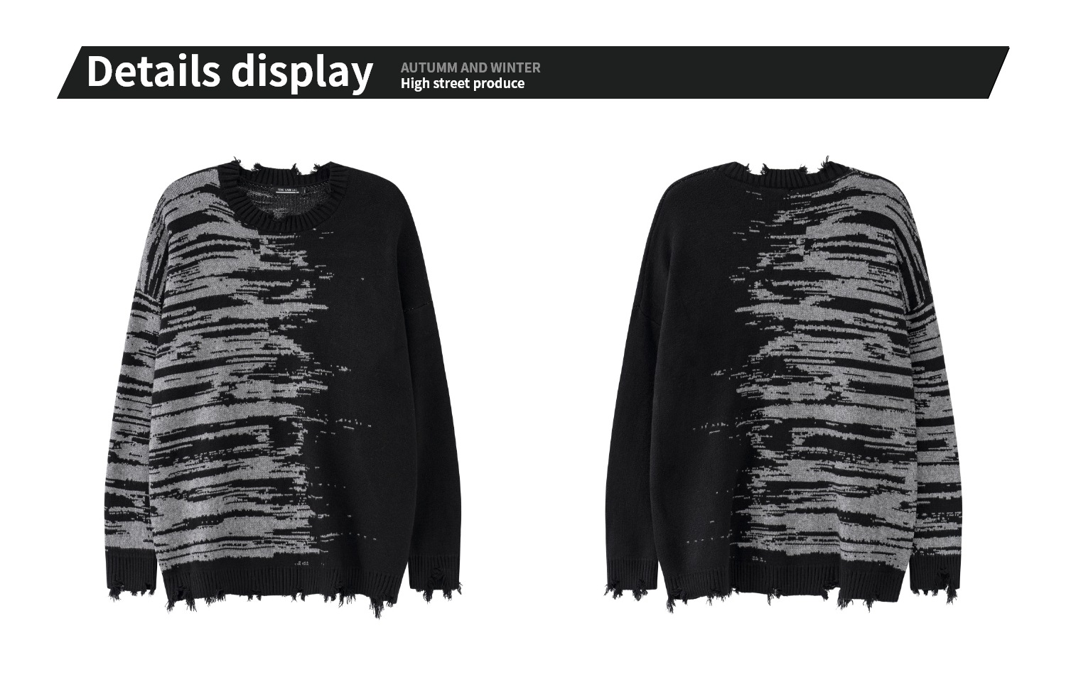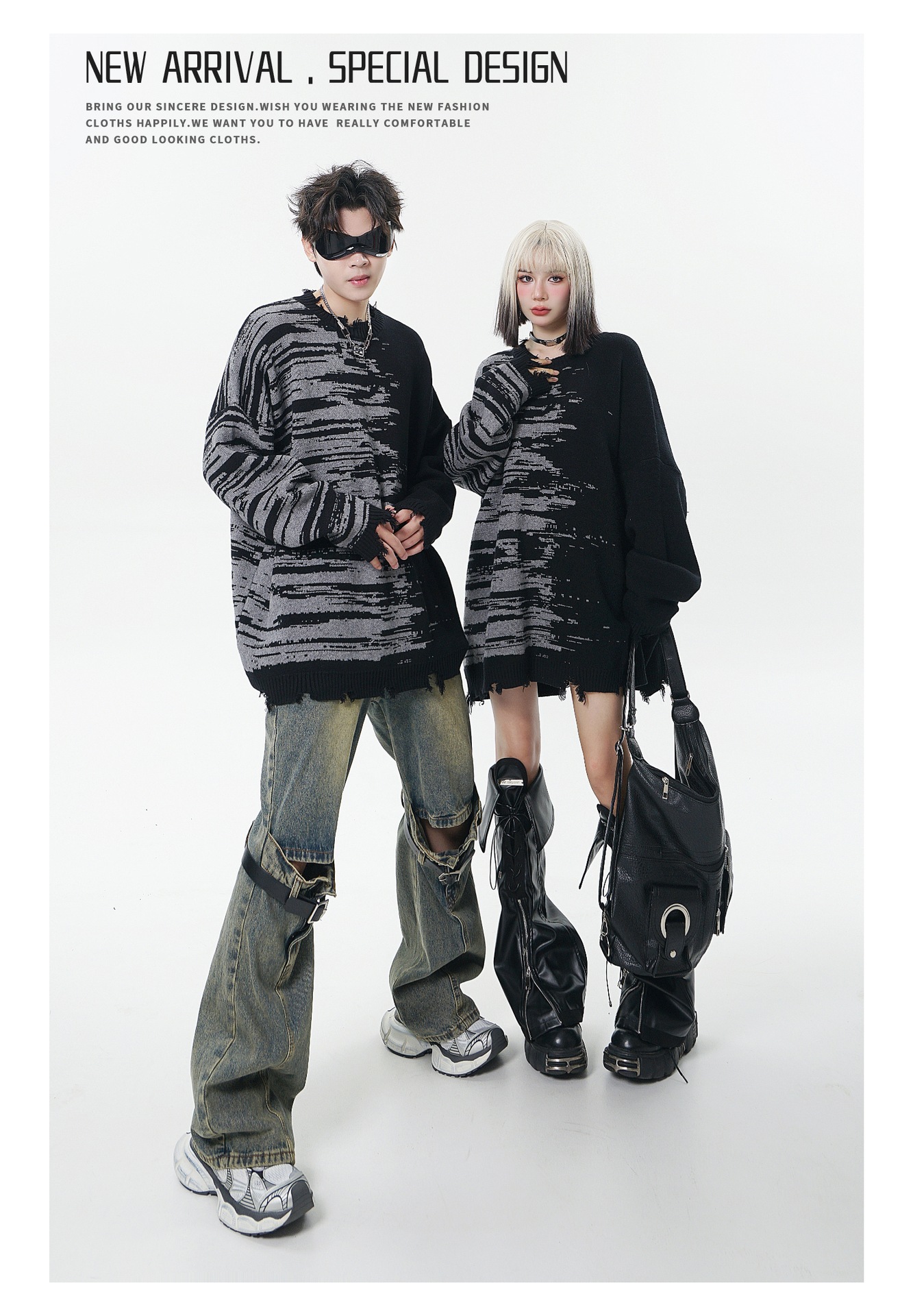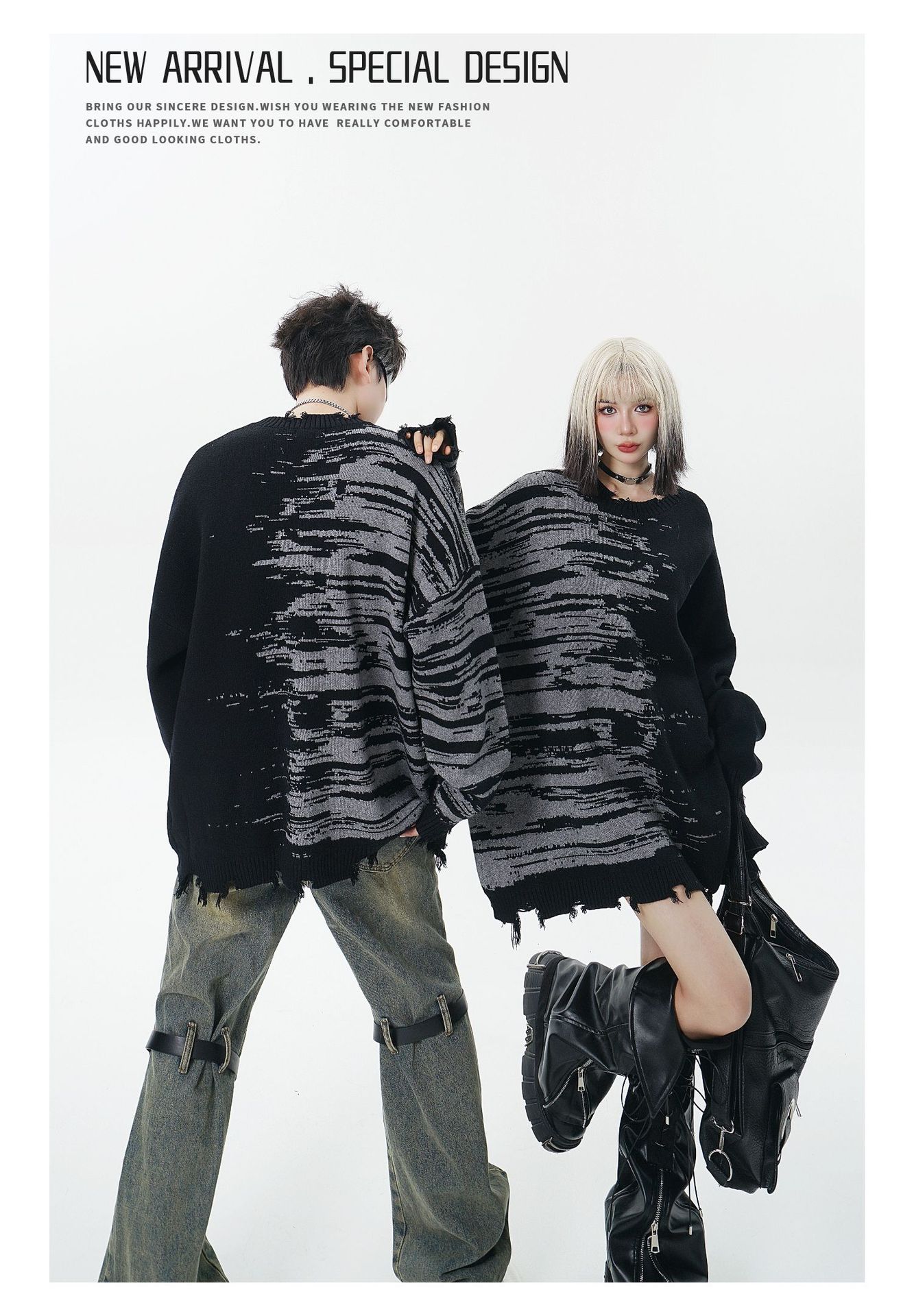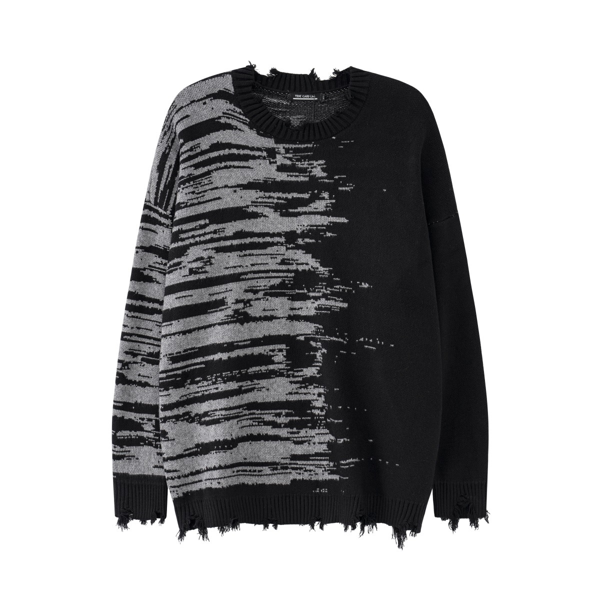 Zebra Pattern Color Matching Ripped Tassel Loose Round Neck Knitted Sweater
