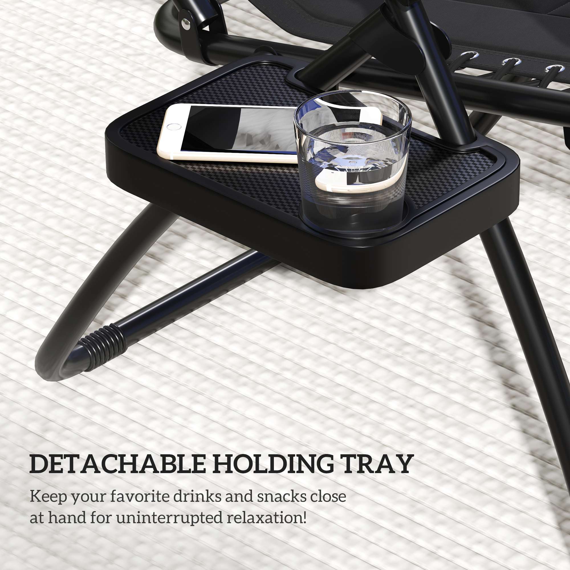 • Tray with cup holder to keep drinks within easy reach