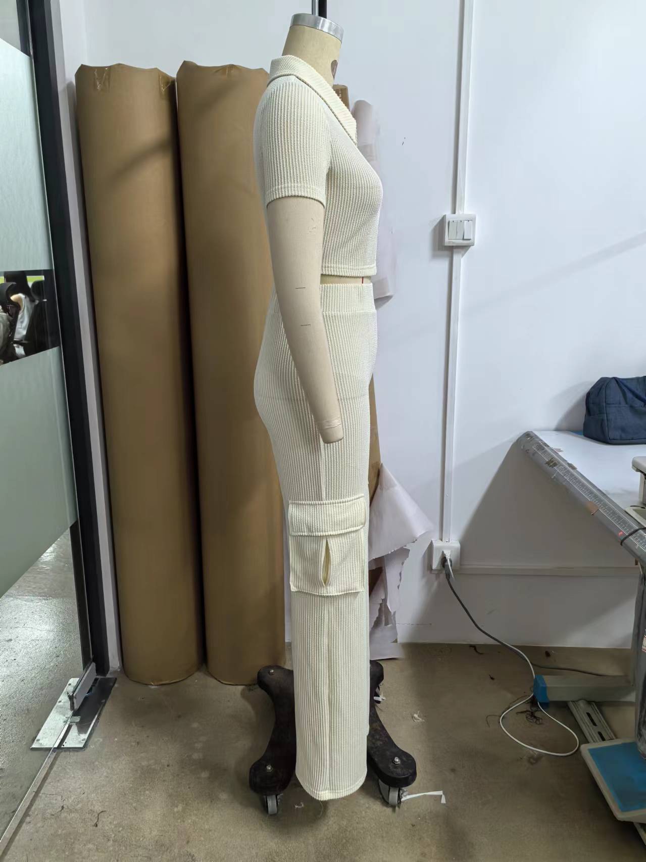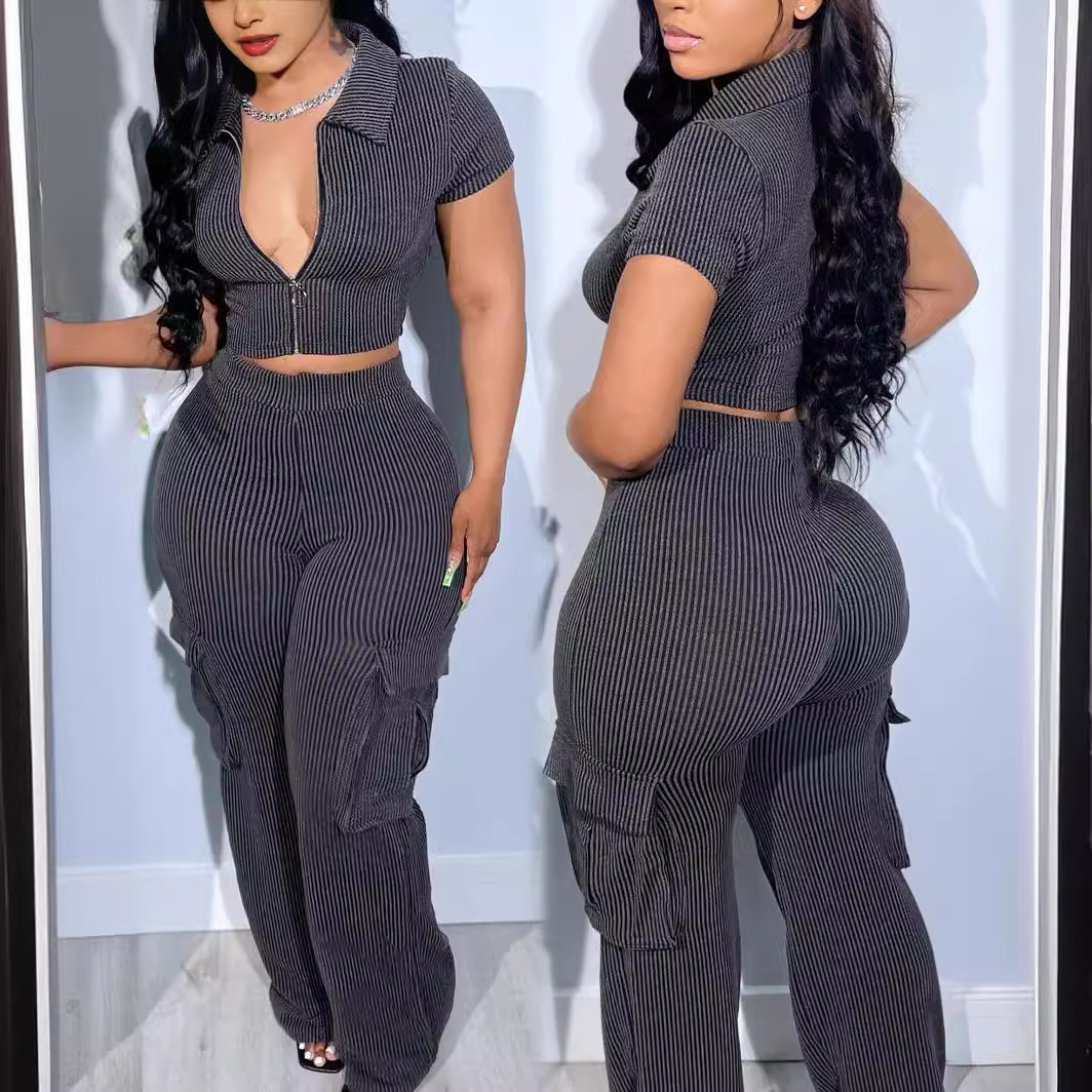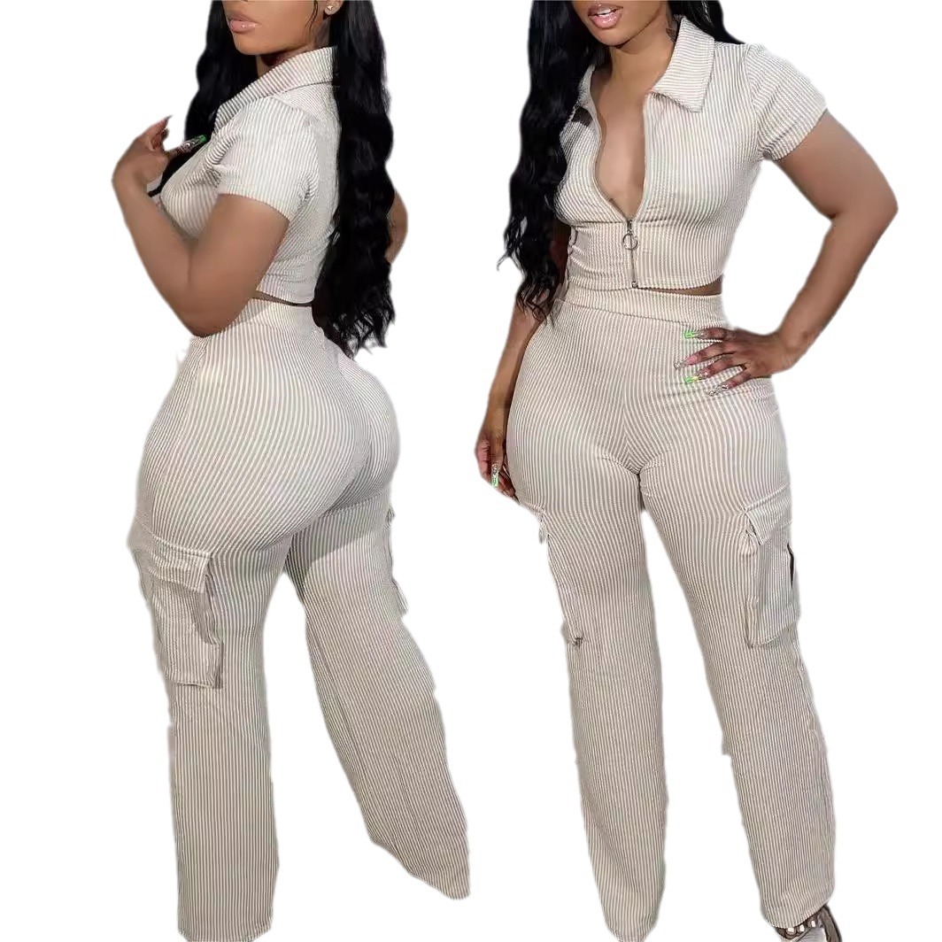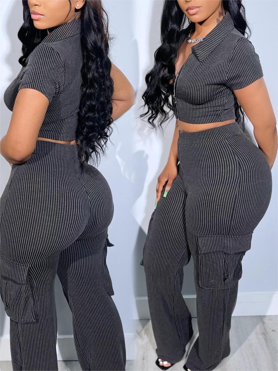Zip-up Top With Multiple Pockets And Long Pants Casual Solid-color Two-piece Set
