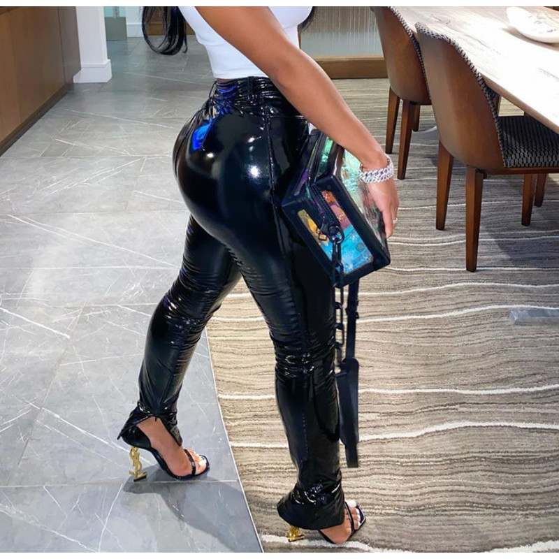 Zipper slit shiny leather small feet leather pants