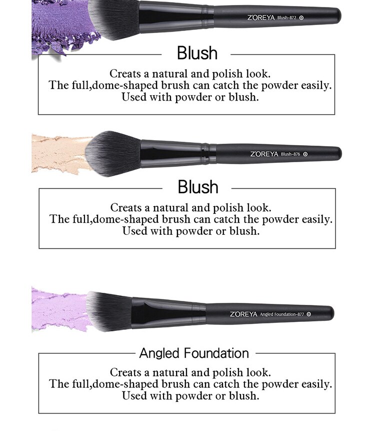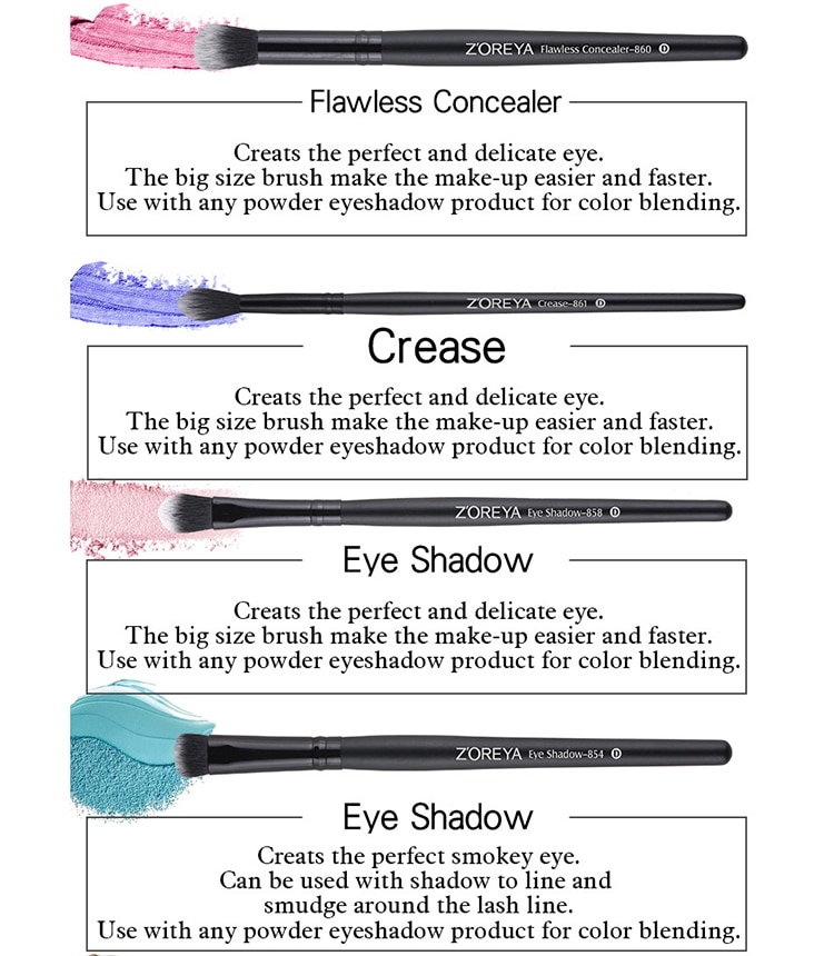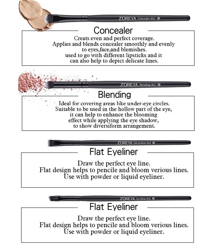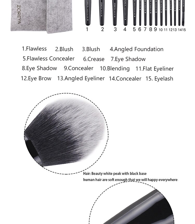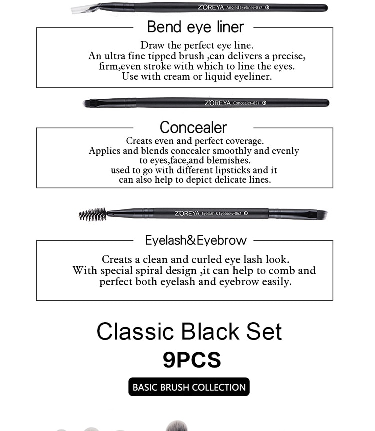 The brush contains: flawless face, blush corner, blush, corner foundation, perfect correction pen, wrinkles, eye shadow, eye shadow, concealer, liquid mixture, eyeliner,